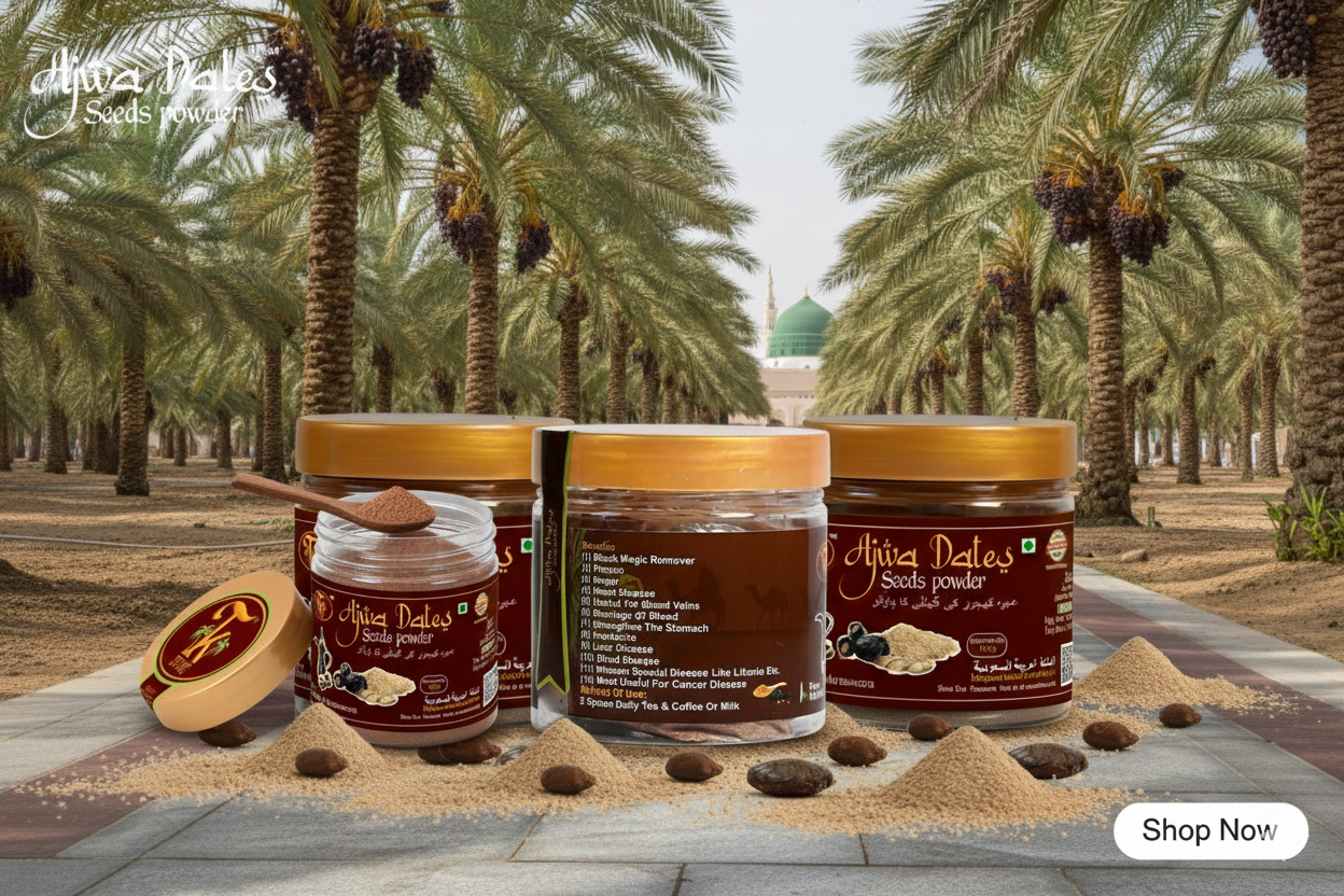 Ajwa Dates Seeds Powder (100g) is carefully prepared from selected Ajwa date seeds directly sourced from Madinah, Saudi Arabia. The seeds are cleaned, roasted, and finely ground to provide a natural, plant-based powder. Hygienically packed to maintain freshness, it can be easily mixed with warm water, milk, honey, or smoothies for everyday use.