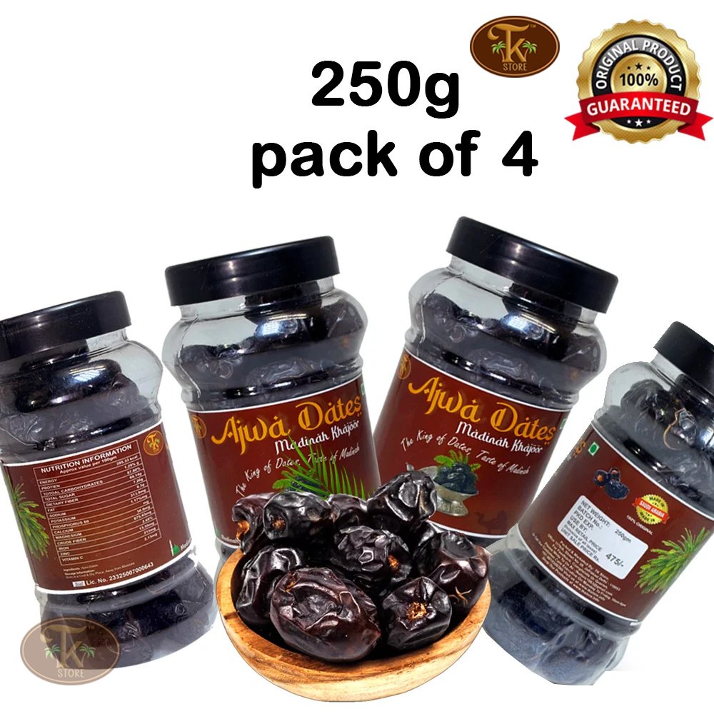 Combo of 4 × 250g packs (1KG total) of authentic Ajwa Dates from Madina Munavvara. Naturally sweet, nutritious & full of blessings.